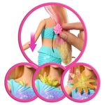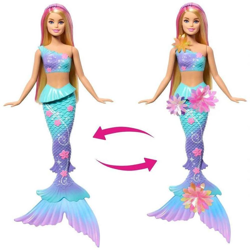 A boneca Barbie Sereia com Transformação de Flor é divertida! Deslizar a alavanca em suas costas para ver as flores "desabrocharem" magicamente de seu corpete até suas nadadeiras, várias e várias vezes! As crianças podem brincar com essas bonecas na terra e na água, para um lindo espetáculo de florescimento sob o sol ou no mar. Com suas flores iridescentes, nadadeiras ombreadas e faixa de cabelo com pérolas em seu lindo cabelo longo e loiro com mechas cor-de-rosa, essa boneca Barbie sereia é tão encantadora quanto um jardim submarino. A boneca não pode ficar em pé ou nadar sozinha. As cores e as decorações podem variar.