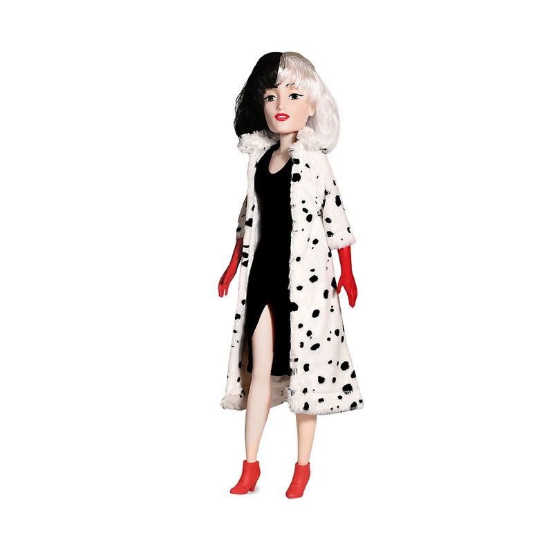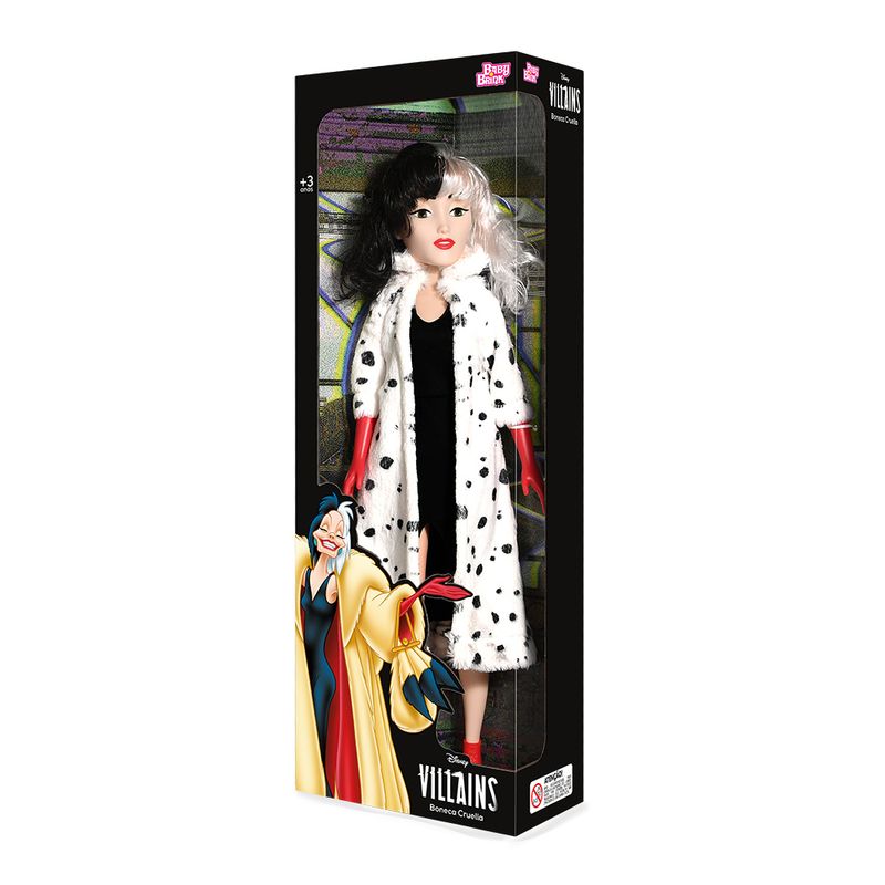Boneca Cruella Disney Novabrink, uma linda boneca com 55cm de altura com roupas e características iguaizinhas a da vilã da Disney mais amada pela criançada.