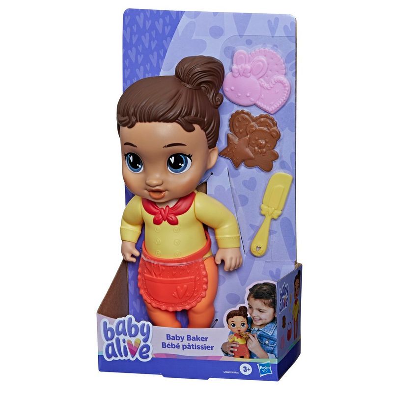Sirva uma deliciosa guloseima com o conjunto de boneca Baby Alive Baby Baker! Vem com acessórios Baby Alive desenvolvidos para imaginar histórias doces inspiradas na confeitaria. Prepare a boneca Baby Alive Gigi Giggles para a diversão na cozinha colocando seu avental plástico sobre a roupa inspirada em padaria. Em seguida, use o acessório de espátula para imaginar que está misturando um lanche delicioso! Por fim, finja alimentar o bebê com seus biscoitos de brinquedo! Os acessórios de comida para bebê em plástico permitem que as crianças tenham a diversão da brincadeira de alimentar sem nenhuma bagunça ou necessidade de limpeza! Esta boneca Baby Alive Gigi Giggles morena possui cabelo moldado em plástico e braços e pernas móveis. Imagine assar uma receita divertida com os playsets Baby Alive, brinquedos de comida e bonecas para meninas e meninos!