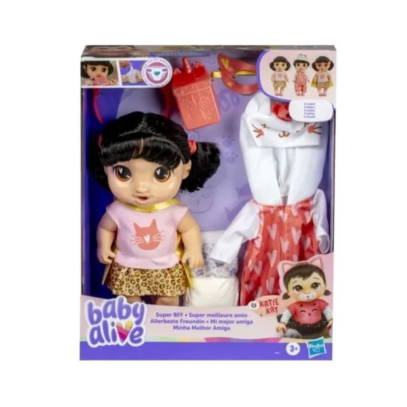 Muitas aventuras com a boneca Baby Alive Minha Melhor Amiga! Esta adorável amiguinha é perfeita para meninos e meninas que adoram brincar de super-heróis. As crianças podem misturar os vários trajes da boneca para criar diversos estilos. Vem com saia, camiseta, máscara de super-herói, capa, meia e pijama de gatinha. As crianças podem enfeitar a boneca com a faixa para cabelo de gatinha. Excelente presente de natal ou aniversário para meninos e meninas a partir dos 3 anos.