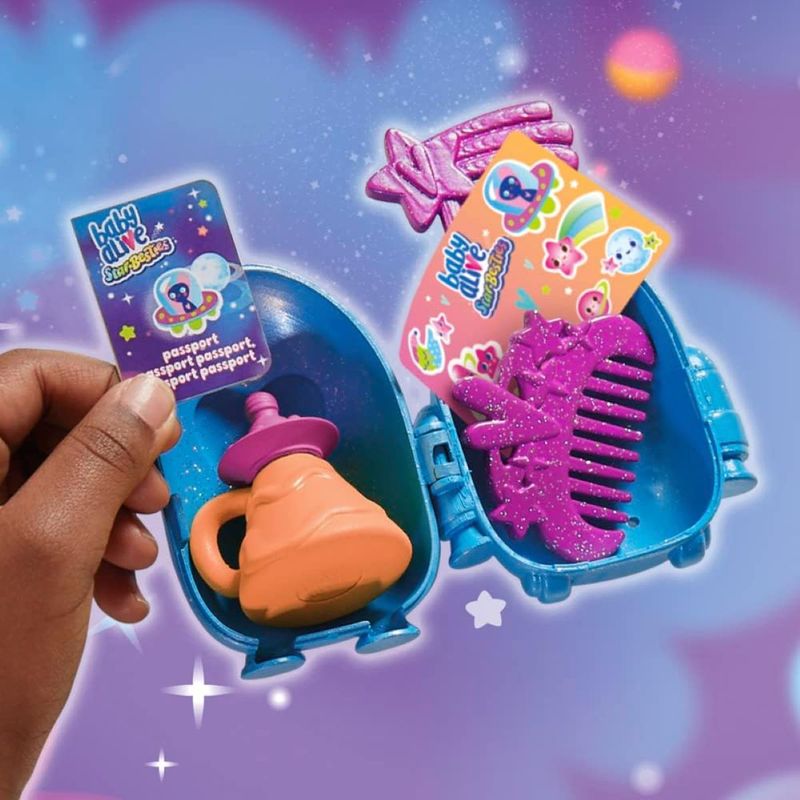 BONECA E ACESSÓRIOS INSPIRADOS EM VIAGENS ESPACIAS: Inclui acessórios Baby Alive como saia removível, mala espacial, passaporte planetário, suco, pente e adesivos