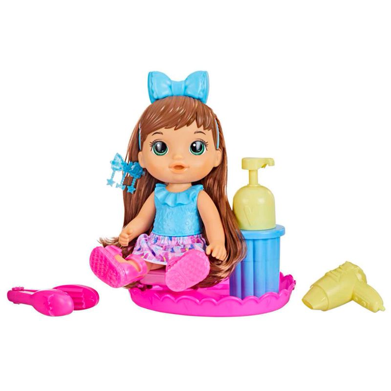 - Cadeira de Salão De Beleza e Acessórios: Esta boneca Baby Alive de 30 cm vem com uma cadeira de salão e acessórios como pente, ferramenta de beleza, secador de cabelo, espelho e presilha;
