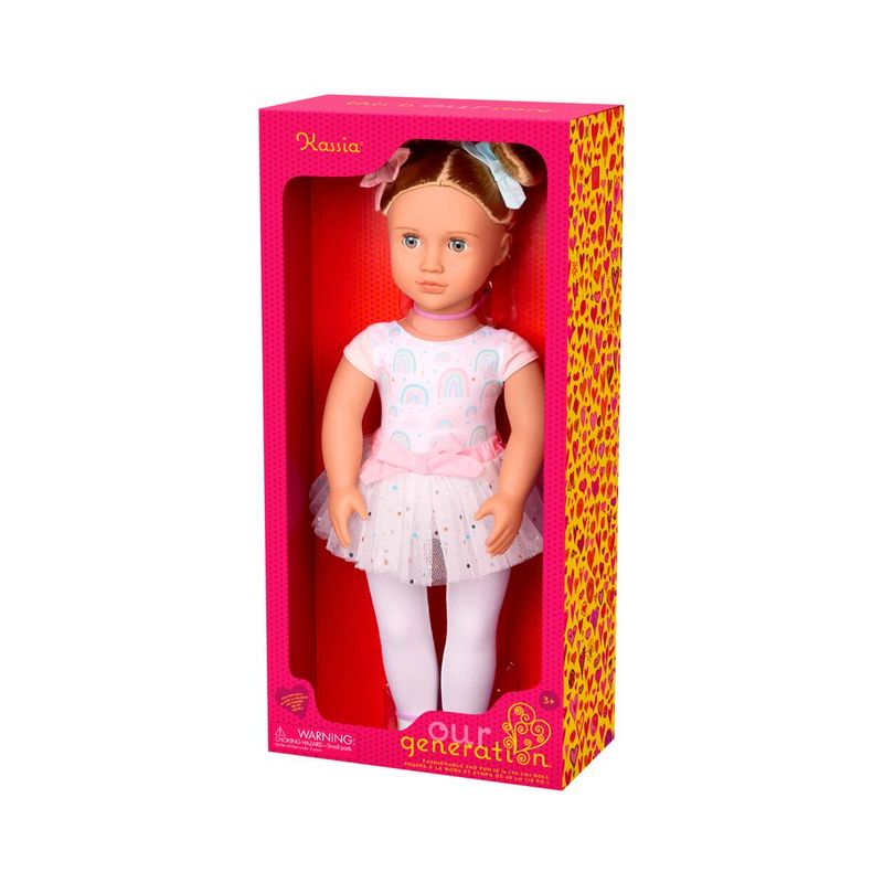 A Boneca Bailarina Our Generation Kassia vai encantar crianças que amam dança, delicadeza e muita imaginação! Com 46 centímetros de altura e articulações móveis, Kassia está pronta para brilhar nos palcos com seu visual encantador: ela veste um collant rosa claro estampado com arco-íris, uma saia de tule branca com glitter colorido, meia-calça branca e sapatilhas azul claro com tiras cruzadas, típicas de uma bailarina clássica. Seus lindos cabelos loiros estão presos em dois coques adornados com laços cor-de-rosa e azul, prontos para um espetáculo cheio de magia.