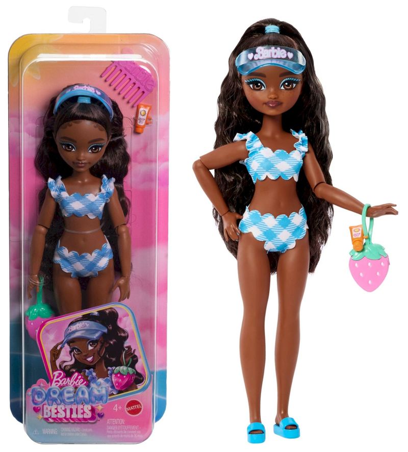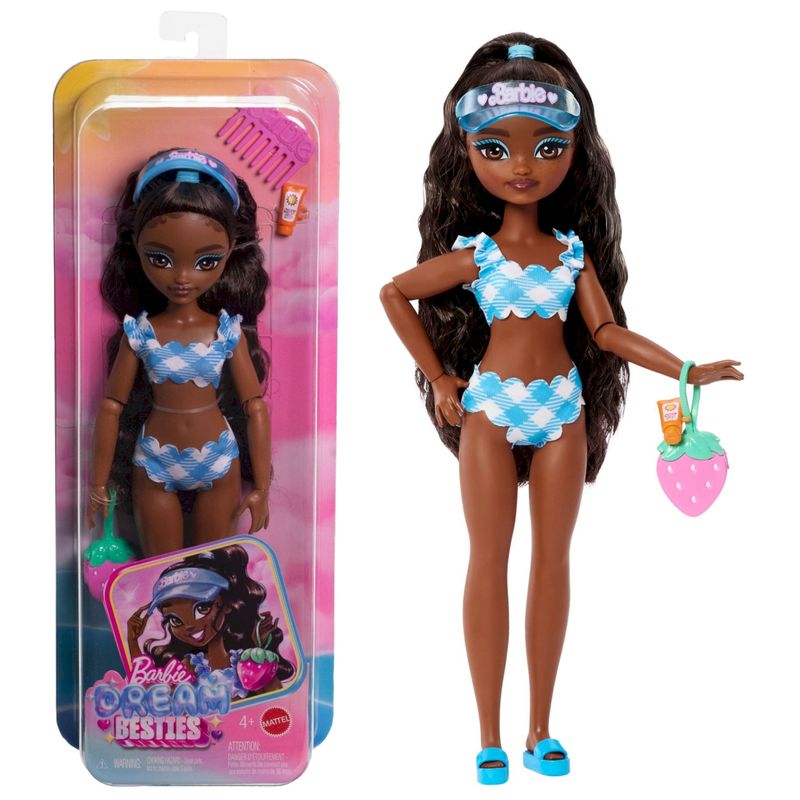 Boneca Barbie Brooklyn da Praia Fabricante: Mattel. Coleção: Barbie Dream Besties Tamanho: 29 cm de altura. As bonecas Barbie Dream Besties incentivam as crianças a compartilhar suas personalidades únicas e suas modas com o mundo! Veja a Barbie "Malibu", a Barbie "Brooklyn", a Teresa e a Renee vestidas com seus trajes de banho estampados (Modelos Vendidos Separadamente)! As bonecas fashion incluem acessórios com tema de praia e cabelos compridos para que você se divirta com o estilo. As bonecas Barbie Dream Besties inspiram crianças a partir de 4 anos de idade a viverem seus sonhos. A boneca não pode ficar em pé sozinha. As cores e as decorações podem variar.