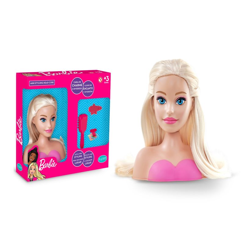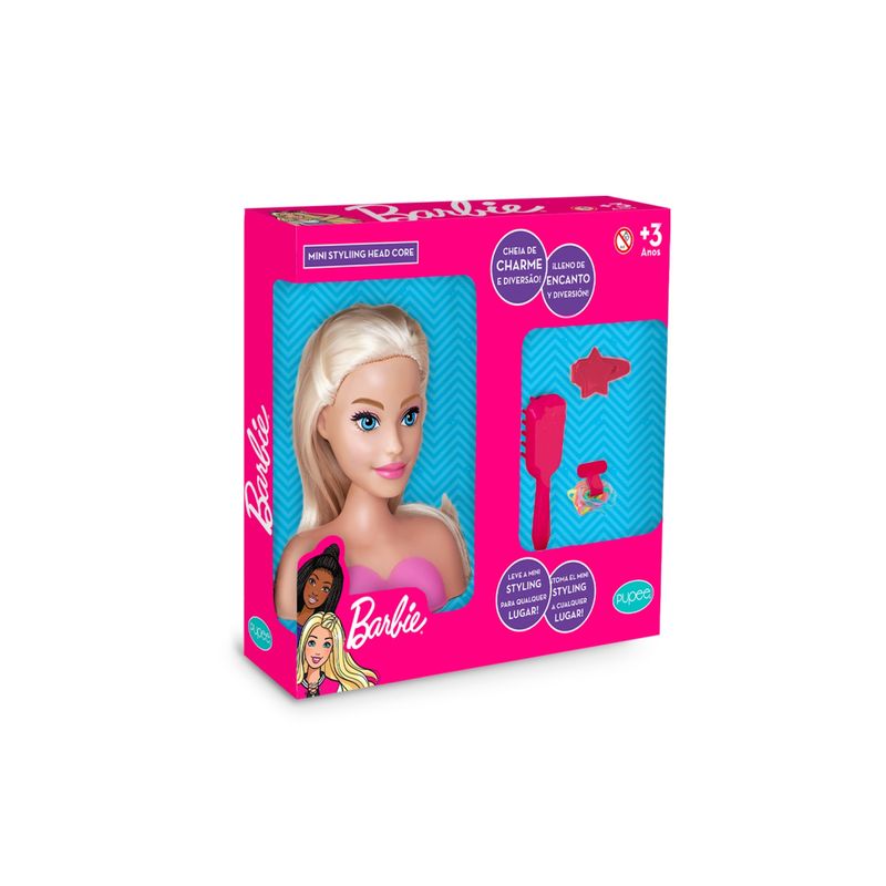 A última linha de bonecas Barbie Mini Styling Head Core inclui 01 Boneca Barbie, 01 Escova para Cabelo, 01 Presilha Estrela e 10 Elásticos de Silicone. Com aproximadamente 15 cm de altura, a Barbie Mini Styling Head Core possibilita que a criança leve para qualquer lugar.