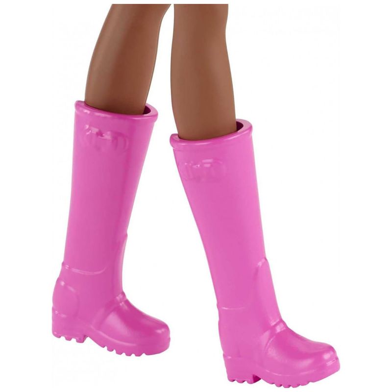 Pronta para ajudar seus clientes, a boneca Barbie usa um adorável vestido estampado de guingão com bata florida e botas altas rosa.