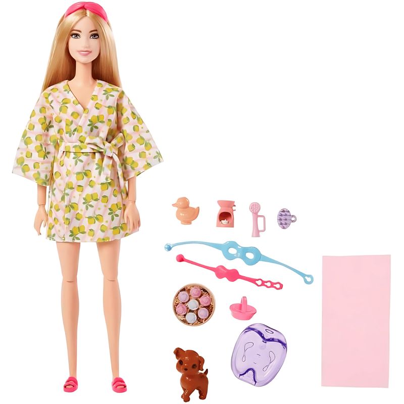 Este conjunto de boneca e acessórios com tema de spa celebra sua forma favorita de recarregar as energias, que inclui uma boneca, um cachorrinho e brinquedos temáticos que permitem que as crianças brinquem com um momento clássico de autocuidado. A boneca Barbie usa roupas elegantes e confortáveis e tem e várias peças para criar narrativas e estimular a exploração e a brincadeira.