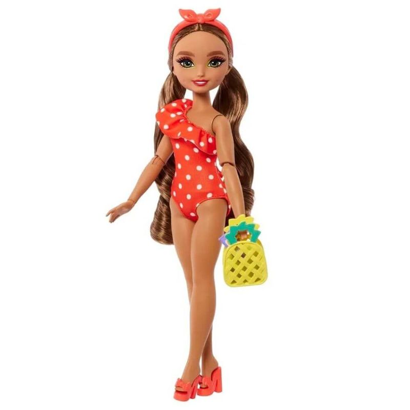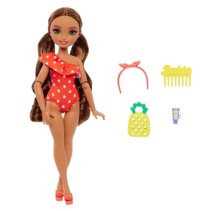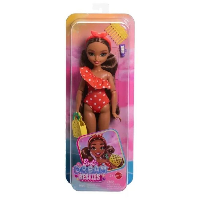Contém: 1 boneca Barbie Dream Besties vestindo roupas de banho e sandálias removíveis, 1 bolsa de frutas, 1 protetor solar, 1 pente e 1 outro acessório.