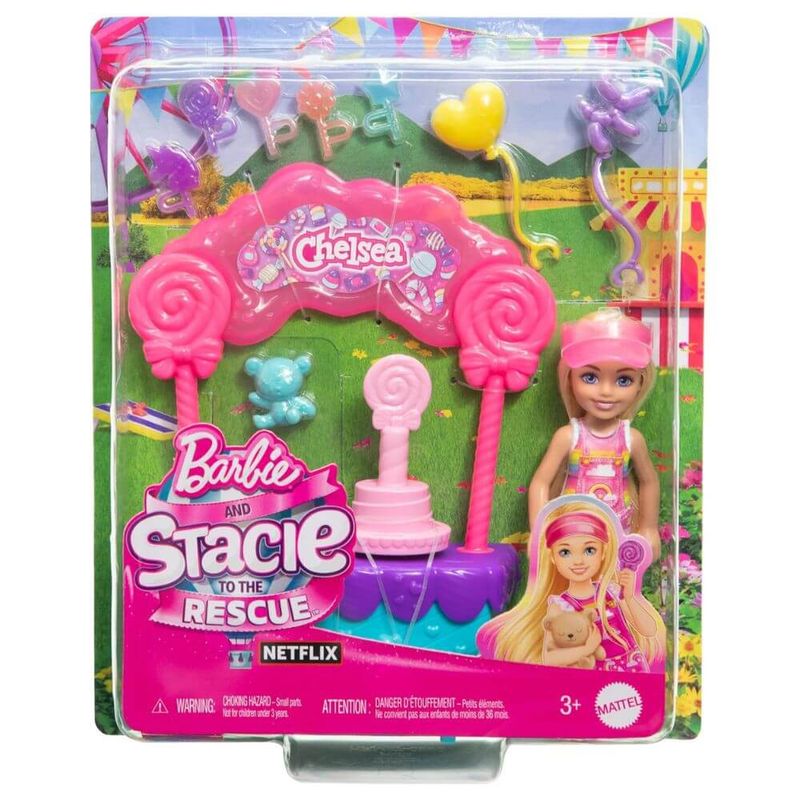 O conjunto de Estação de Doces e Pirulitos está repleto de diversão adocicada! O balcão da loja tem uma caixa registradora e um display giratório de pirulitos. Os acessórios para venda incluem um ursinho de pelúcia, pirulitos e balões que realmente cabem nas mãos das bonecas. A boneca Chelsea está pronta para comandar o estande como uma pequena chefe com seu visor rosa e vestido arco-íris. As crianças podem reproduzir esse momento favorito do filme de animação Barbie e Stacie to the Rescue! A boneca não pode ficar em pé sozinha. As cores e as decorações podem variar.
