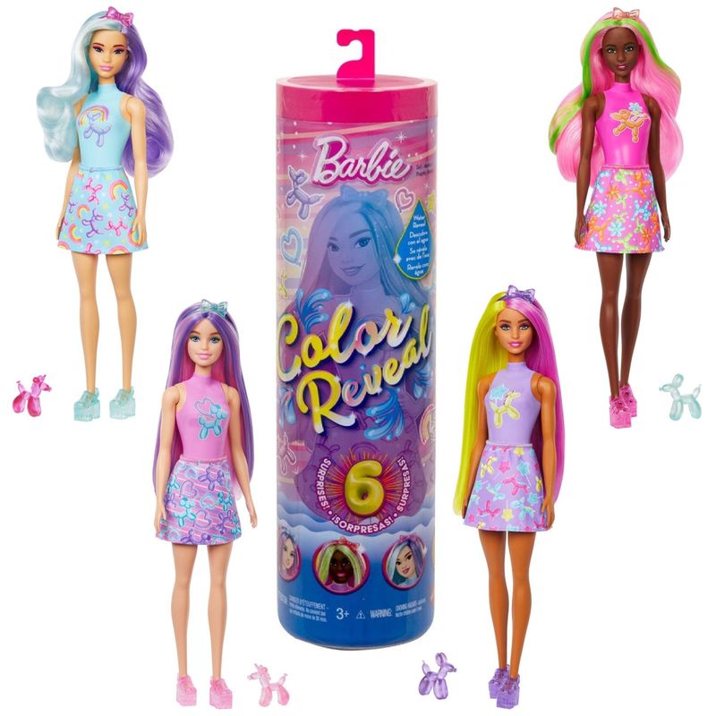 Boneca Barbie - Estilo Surpresa Fabricante: Mattel. Coleção: Color Reveal - Série Animais de Balão. As bonecas Barbie Color Reveal trazem uma surpresa divertida para as crianças quando abrem a embalagem — seis delas! Nesta série inspirada em animais de balão coloridos, as crianças encontram uma das quatro bonecas exclusivas, cada uma com uma mecha brilhante no cabelo comprido. Retire tudo e encha o tubo com água morna, depois insira a boneca e gire. Qual boneca você vai revelar? As roupas e acessórios para descobrir incluem uma saia rodada com estampa colorida, tiara, sapatos plataforma e um animal de balão. Transforme o corpete da boneca com água gelada e morna para ainda mais diversão e use o tubo da embalagem para guardar os acessórios. As crianças vão querer todas! Cada boneca é vendida separadamente, sujeita à disponibilidade. As bonecas não ficam em pé sozinhas. As cores e decorações podem variar.