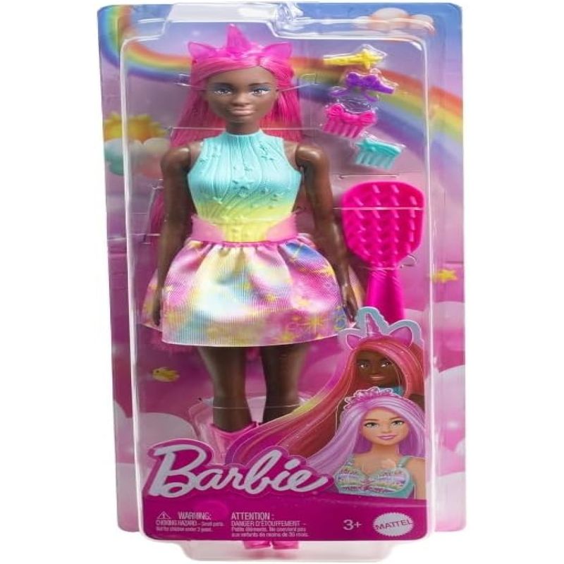 Boneca Barbie Unicórnio com Cabelo Longo Rosa, Escova e Acessórios.