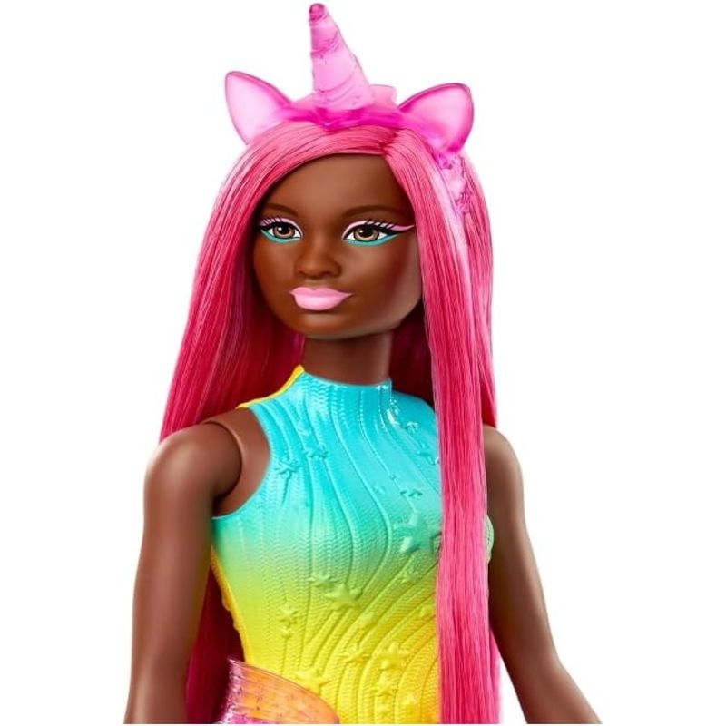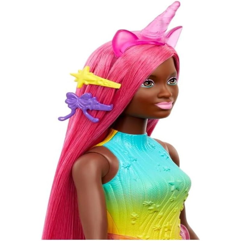 Boneca Barbie Unicórnio com Cabelo Longo Rosa, Escova e Acessórios.