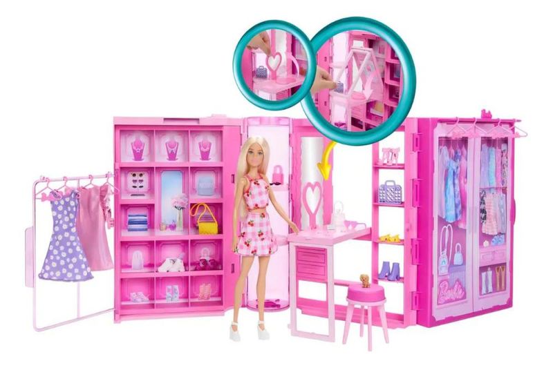 -Este Armário dos Sonhos da Barbie está repleto de estilos e histórias infinitas que as crianças podem criar para a Barbie! -Ao abrir o guarda-roupa rosa brilhante, revela-se um conjunto de 3 pés de largura com 2 cabides, mais de 20 espaços de armazenamento, uma penteadeira dobrável com espelho pop-up, espelho de corpo inteiro e prateleira para sapatos. -Há até um travesseiro para o cachorrinho de estimação! As crianças vão adorar estilizar a boneca Barbie com mais de 25 roupas e acessórios, como vestidos, sapatos, colares e bolsas. -É possível misturar e combinar 3 looks completos para a Barbie e mergulhar no estilo e na brincadeira de contar histórias. -As crianças podem ajudar a Barbie a escolher um outfit no cabide, estilizar com acessórios no espelho e, em seguida, finalizar o look na penteadeira antes de sair em grande estilo com seu cachorrinho para um dia incrível! -Para facilitar o armazenamento, todas as peças cabem dentro do armário, que vem com uma alça rosa da Barbie para diversão em qualquer lugar. A boneca não pode ficar em pé sozinha. As cores e decorações podem variar. Características: Marca - Mattel Cód. HXD58 Conteúdo - 1 boneca Barbie fashion, mais de 25 peças, mais de 20 espaços de armazenamento, 2 cabides, uma parede de sapatos e muito mais.