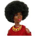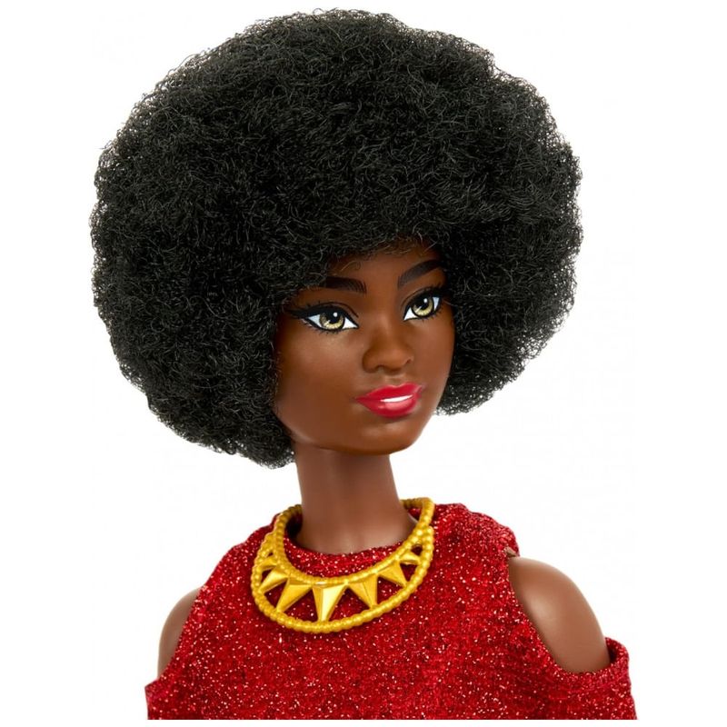 O vestido vermelho é removível, o que permite trocas de roupa e amplia as possibilidades de montagem de looks com outras peças da linha Fashionistas. Os sapatos de salto em tom vermelho e o colar dourado de destaque completam o conjunto, adicionando contraste e reforçando a estética de festa e comemoração de aniversário da marca. A boneca segue o conceito de diversidade da coleção Fashionistas, com combinação de tom de pele, tipo de cabelo e silhueta que contribuem para um portfólio mais representativo.