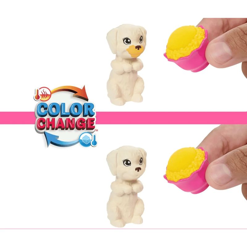 Este conjunto tem tudo para uma noite divertida, incluindo uma boneca Barbie, seus 2 filhotes e um saco de dormir que cabem os 3! Para repetir a diversão da mudança de cor, basta aplicar água gelada com a esponja de pipoca para mudar o rosto do filhote de cachorro de limpo para amanteigado. Você pode usar a toalha com água morna para limpar novamente!
