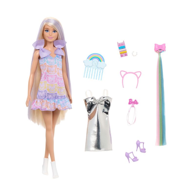 - Os acessórios de estilo incluem um prendedor com extensão de cabelo arco-íris, uma faixa de cabeça com orelhas de gato, um conjunto de elásticos de cabelo e um conjunto de grampos de cabelo!