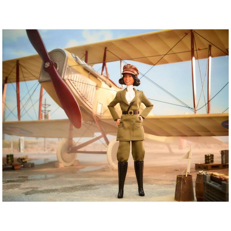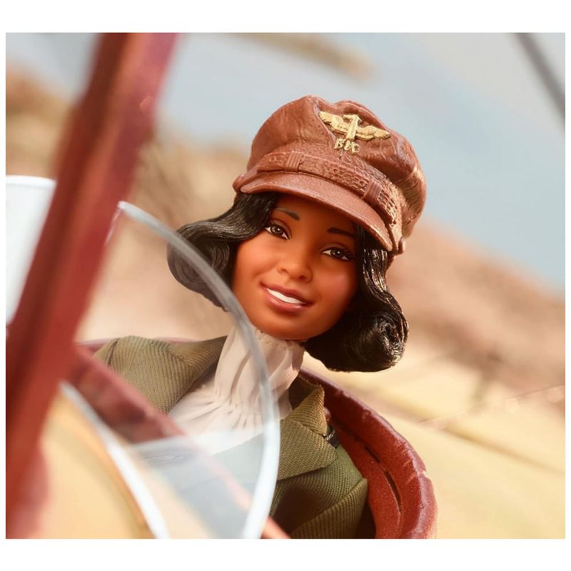 Esta boneca Barbie Inspiring Women homenageia Bessie Coleman. Ela foi a primeira piloto negra e nativa americana e a primeira negra a obter uma licença internacional de piloto.