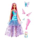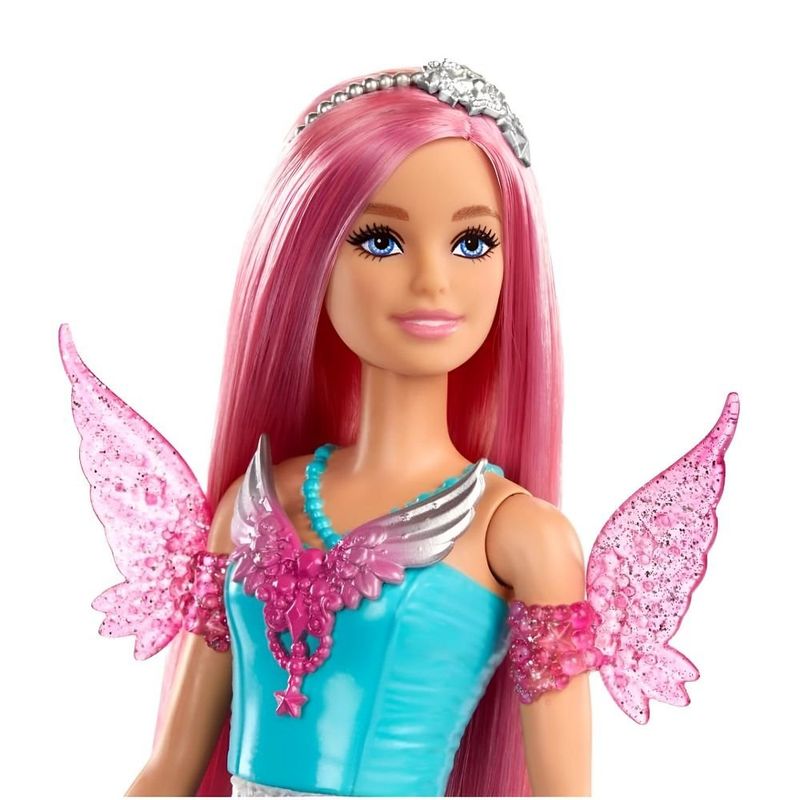 Esta boneca Barbie adiciona um toque mágico à brincadeira com seu cabelo! Ela tem cabelos rosa pastel de 17 centímetros de comprimento e inclui acessórios como um pente, uma faixa de cabelo brilhante e um grampo de cabelo decorativo.