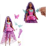 Modelada após seu visual brilhante em Barbie A Touch of Magic, a boneca Barbie “Malibu” Roberts vem com um vestido inspirado em conto de fadas, animais de estimação e acessórios. Esta boneca Barbie dá um toque mágico ao jogo de cabelo! Ela tem cabelo rosa pastel de 7 polegadas de comprimento e inclui acessórios como pente, faixa brilhante e grampo de cabelo decorativo.