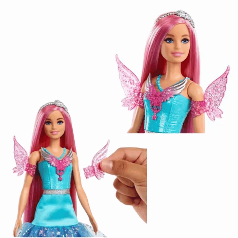 Modelada após seu visual brilhante em Barbie A Touch of Magic, a boneca Barbie “Malibu” Roberts vem com um vestido inspirado em conto de fadas, animais de estimação e acessórios. Esta boneca Barbie dá um toque mágico ao jogo de cabelo! Ela tem cabelo rosa pastel de 7 polegadas de comprimento e inclui acessórios como pente, faixa brilhante e grampo de cabelo decorativo.
