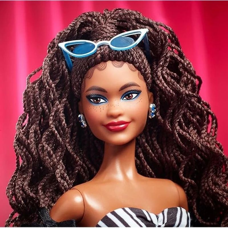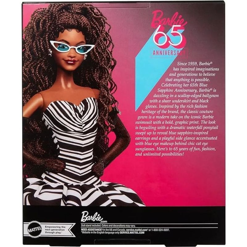 A Barbie celebra seu Aniversário de 65 anos com uma boneca colecionável no estilo único que a caracteriza. Como parte da celebração, seu look comemorativo inclui belos detalhes que fazem referência à Barbie original de 1959. Seu vestido branco e preto com toques de cor safira são imprescindíveis para os colecionadores, fãs da Barbie e da moda. Inclui suporte para bonecas e Certificado de Autenticidade. A boneca não pode ficar de pé sozinha. As cores e decorações podem variar.