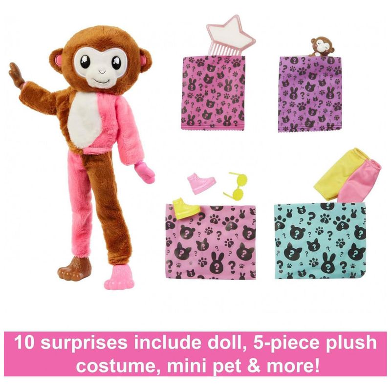 Inclui fantasia da boneca Barbie Cutie Reveal conjunto de 5 peças e 4 bolsas contendo mini bichinho, pente esponja, óculos de sol, 1 par de sapatos e uma peça de roupa. Boneca não pode ficar sozinha. Cores e decorações podem variar.