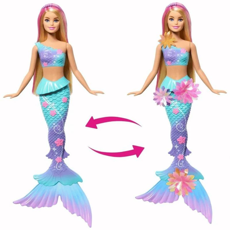 Com suas flores iridescentes, nadadeiras ombreadas e faixa de cabelo com pérolas em seu lindo cabelo longo e loiro com mechas cor-de-rosa, essa boneca Barbie sereia é tão encantadora quanto um jardim submarino.