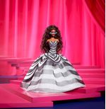 - Ela usa um vestido preto e branco inspirado no maiô que a boneca Barbie original usava. Um corpete justo em formato de coração floresce em uma saia listrada volumosa.