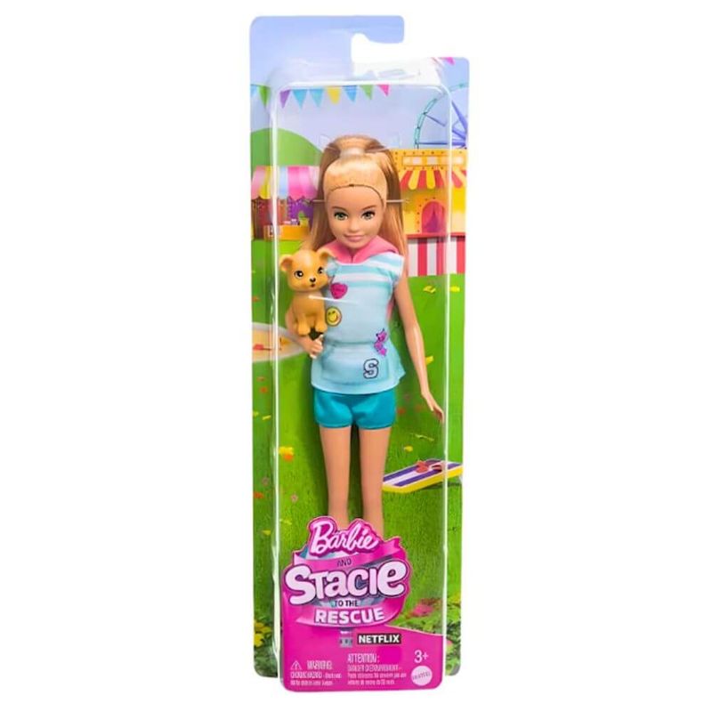 Esta boneca Stacie ajuda você a entrar na aventura de Barbie e Stacie ao resgate! Ela é igualzinha à personagem do filme, com seu rabo de cavalo alto, roupas e acessórios esportivos. A boneca Stacie também vem com um adorável cachorrinho de estimação para que as crianças possam viver aventuras ainda mais emocionantes com a irmã mais nova da Barbie! A boneca não fica em pé sozinha.