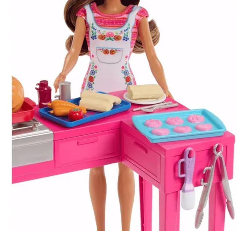 -A imaginação pode criar histórias deliciosas com a boneca Teresa e o conjunto de cozinha Barbie, que inclui mais de 20 acessórios. -Inspirado no filme Barbie e Teresa: Receita de Amizade, o conjunto apresenta uma peça de mobília de cozinha com recursos interativos, como um forno giratório, tamales que se encaixam em uma panela e biscoitos que mudam de cor. -Jovens gourmets vão adorar explorar brincadeiras realistas enquanto cozinham vegetais e servem refeições "deliciosas". -A boneca Teresa está pronta para brilhar, vestindo seu visual característico, acompanhado de um avental especial, presente de sua avó. Crianças e fãs a partir de 3 anos vão se divertir recriando cenas do filme ou inventando novas receitas para suas aventuras! -A boneca não pode ficar em pé sozinha. As cores e as decorações podem variar. Características: Marca - Mattel Cód. JCT06 Conteúdo: Boneca + conjunto de cozinha Barbie, que inclui mais de 20 acessórios.