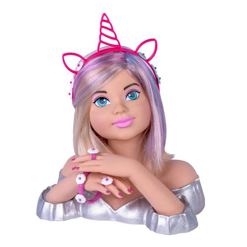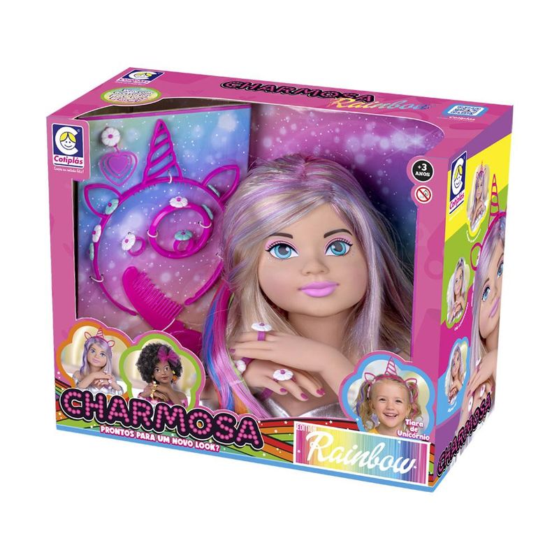 Prontas para um novo look? A Charmosa Rainbow possui um busto de vinil macio e cheio de detalhes. Com os acessórios que a acompanham é possível deixa-la super estilosa e moderna. Seus acessórios podem ser utilizados pelas crianças, são eles: pente, brincos, pulseiras, anéis, tiara de unicórnio e presilhas com apliques coloridos.
