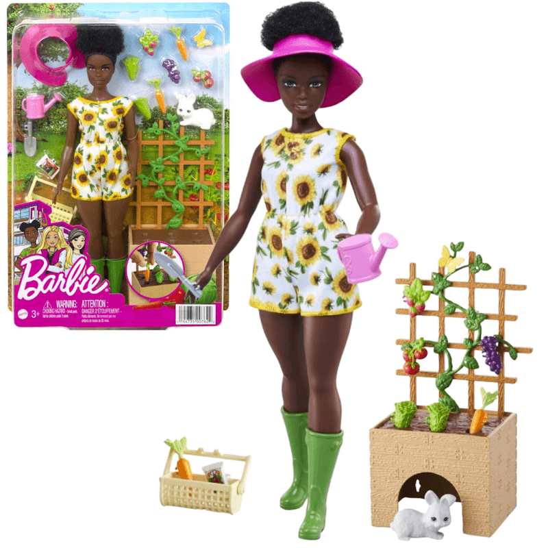 A caixa de jardim apresenta um esconderijo para o coelhinho da boneca Barbie, e a treliça tem um recurso plug-and-play que permite que as crianças plantem e colham produtos deliciosos.