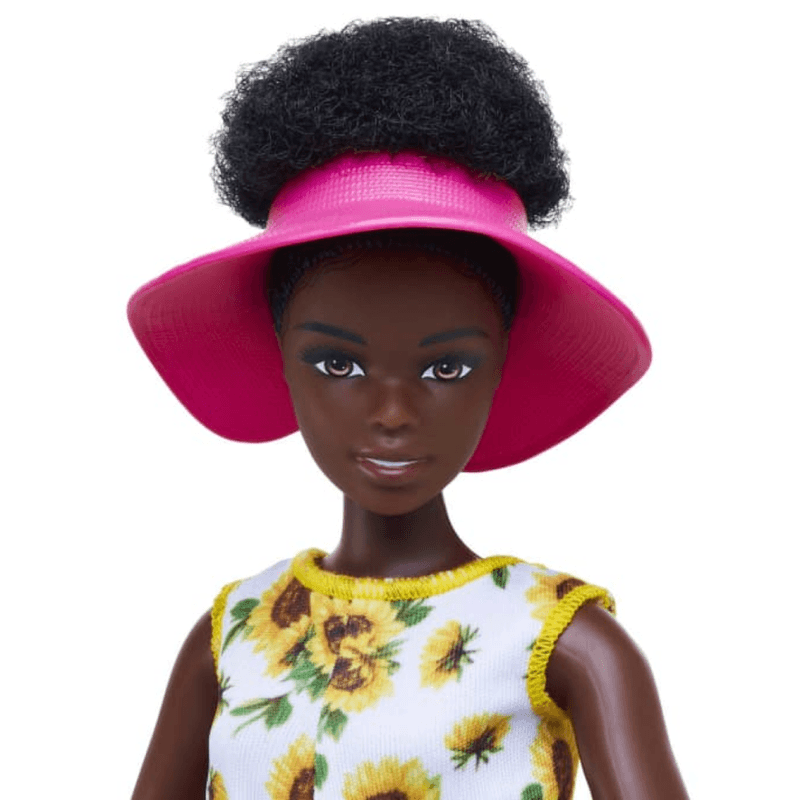 Em um macacão com estampa de girassol, chapéu de sol e botas fofas, a boneca Barbie está pronta para um dia de brincadeira.