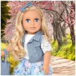 Boneca da moda de tom de pele caucasiano, olhos azuis e lindos cabelos loiros.
