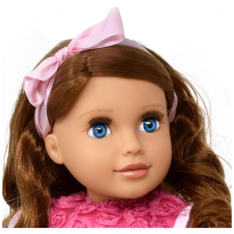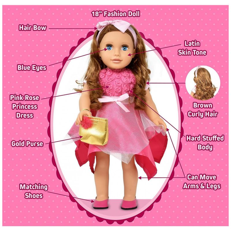 Boneca Fashion de tom de pele latino, olhos azuis e cabelo castanho encaracolado.