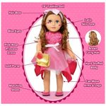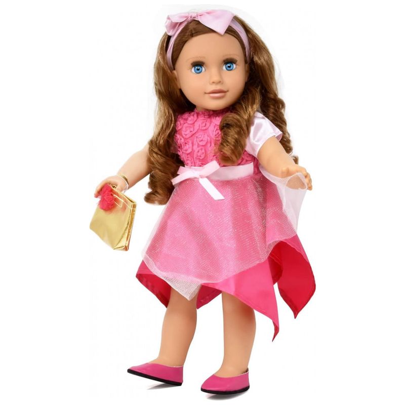 Roupas e Acessórios Vestido princesa rosa rosa com sapato e laço de cabelo combinando, e bolsa dourada.