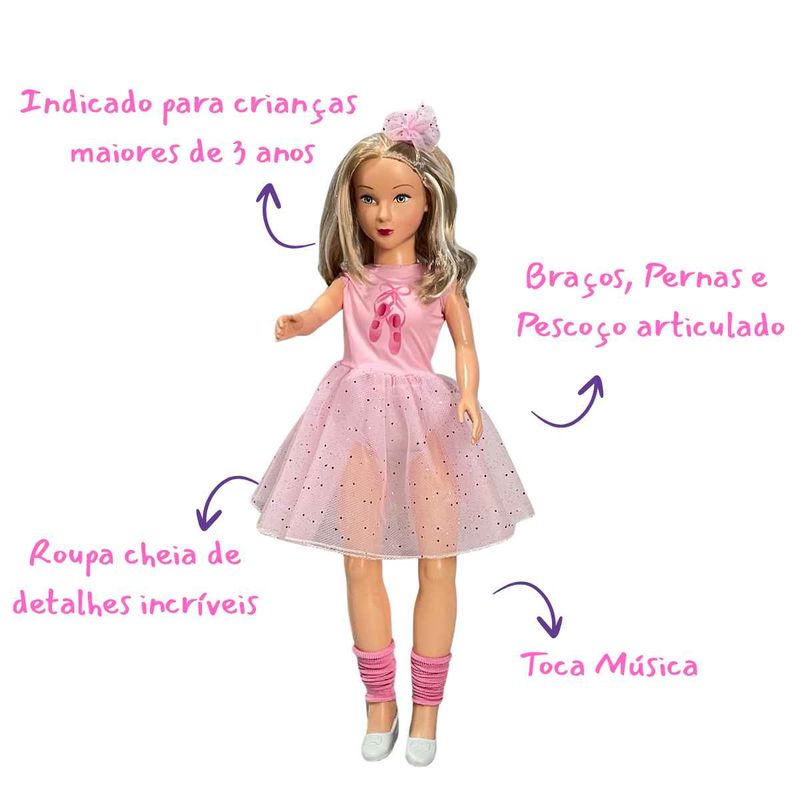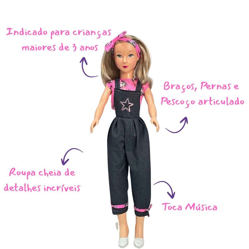 A Boneca Articulada Isabelly mede aproximadamente 80cm, tem detalhes delicados como sapatinhos e tiara removíveis. Essa boneca incrível tem o tamanho perfeito para acompanhar a criançada em suas brincadeiras e aventuras. Ela canta 3 músicas sendo: Roda Roda Roda, Ciranda Cirandinha e Pirulito que Bate Bate.