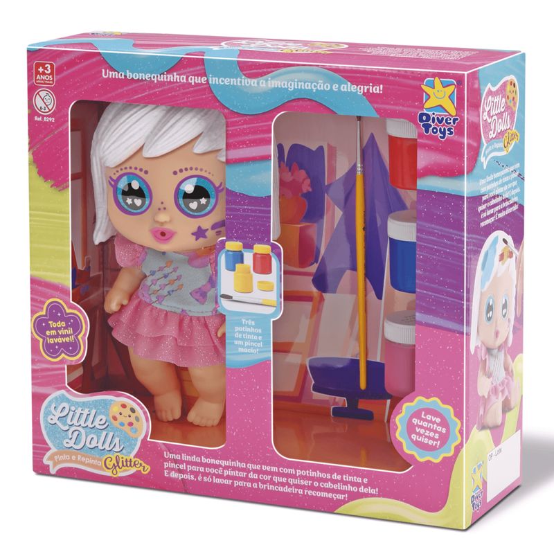 A Boneca Little Dolls Glitter Pinta e Repinta da Divertoys é a companheira perfeita para uma brincadeira cheia de cor e criatividade! Esta linda bonequinha vem com potinhos de tinta e um pincel, permitindo que você pinte o cabelinho dela da cor que desejar. A diversão não tem fim, pois depois de criar um novo visual, é só lavar e começar tudo de novo! Essa atividade é muito divertida e permite que as crianças explorem sua criatividade enquanto personalizam sua boneca repetidamente. A Boneca Little Dolls Glitter Pinta e Repinta não apenas garante horas de entretenimento, mas também desenvolve habilidades motoras finas e estimula a imaginação, proporcionando uma experiência lúdica e educativa.