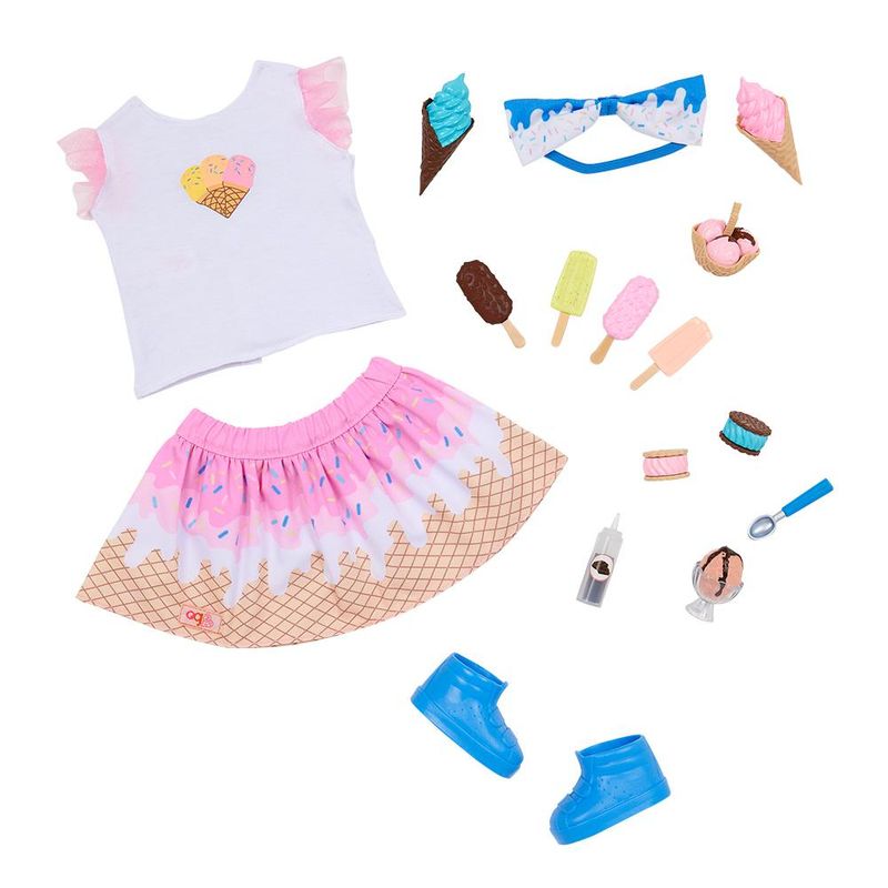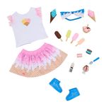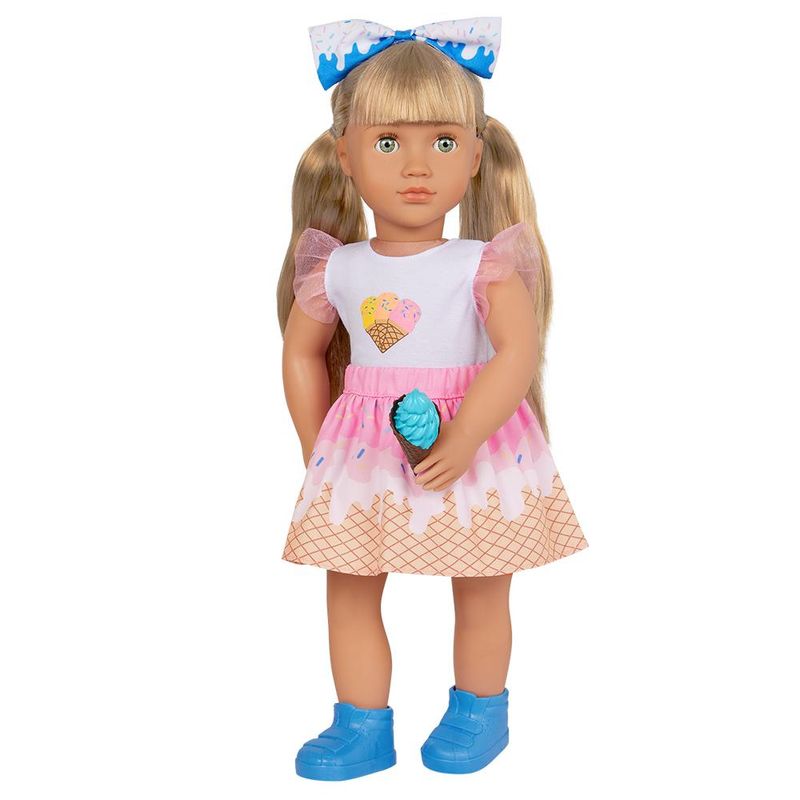 Para explorar doces aventuras e muito estilo com a Boneca Our Generation Lorelei! Esta boneca tem olhos verdes brilhantes que abrem e fecham e longos cabelos loiros que são divertidos de pentear! Ela pode girar o pescoço, os braços e as pernas para trocar de roupa com facilidade e também pode dobrar os joelhos e cotovelos na hora de servir deliciosas guloseimas com seus 10 acessórios para sorveteria! Ela chega vestindo um top super fofo com estampa de sorvete com babados nas mangas, uma saia combinando, um lindo laço no cabelo com estampa de cobertura de sorvete e um par de sapatos azuis.