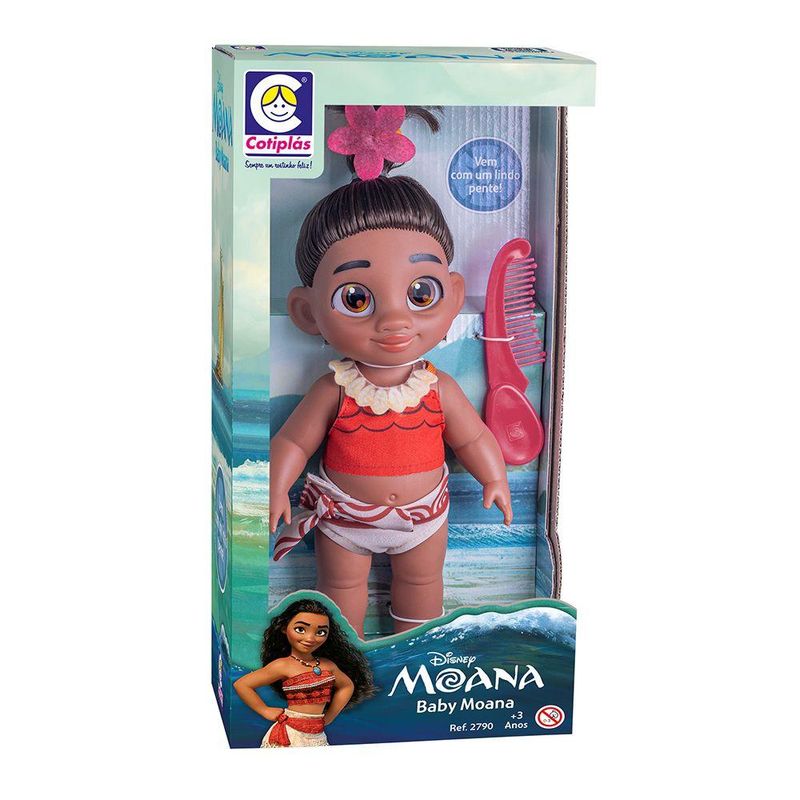 Ficha Técnica:Marca: Cotiplás;Nome do produto: Boneca Moana Baby Pequena;Idade recomendada: A partir de 3 anos;Selo Inmetro: CE-BRI/IQB 0228 IQB-OCP 006;Contém: 1 boneca com acessório.