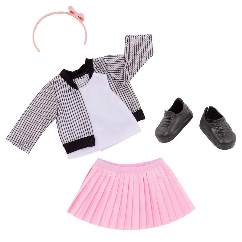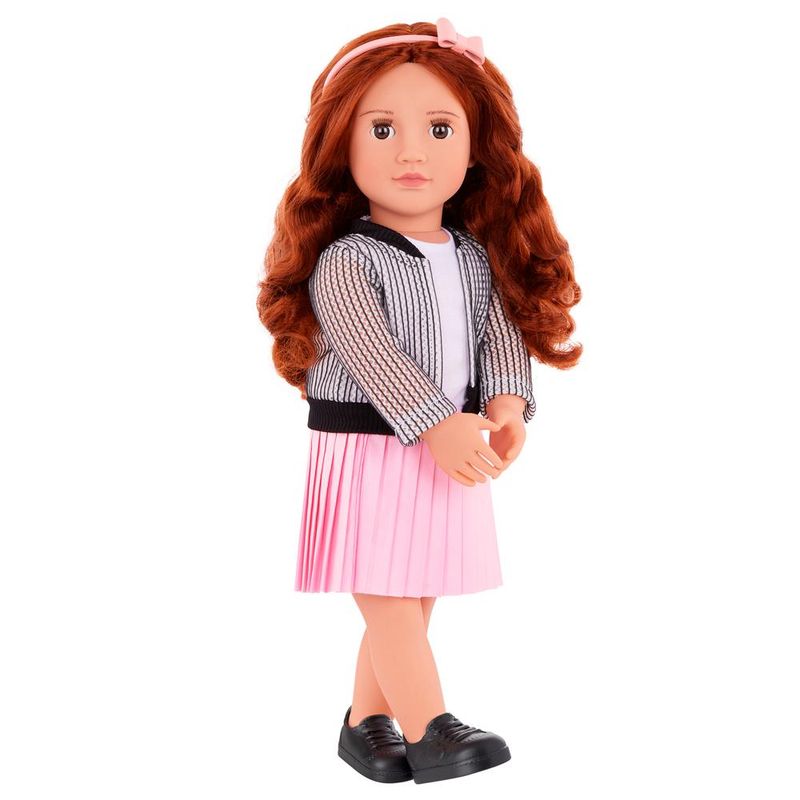 Ela chega vestida com uma jaqueta moderna, blusa casual, saia plissada rosa vibrante, tiara com laço, calcinha e sapatos, ideal para brincadeiras de vestir e contar histórias. Suas articulações no pescoço, braços e pernas facilitam a troca de roupas e ampliam a diversão, permitindo que as crianças explorem a criatividade com as roupas e acessórios Our Generation.