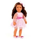 A Boneca Our Generation Katia chegou para brilhar e conquistar corações! Com 46 centímetros de altura, Katia exibe um visual encantador: ela usa um lindo vestido rosa repleto de lantejoulas cintilantes que refletem a luz com suavidade, criando um efeito mágico e sofisticado. A faixa de cetim rosa-escuro na cintura e as mangas de tule transparente completam o look com muito charme. Seus cabelos longos e castanhos, com ondas delicadas, são perfeitos para pentear e criar diversos estilos. Para finalizar, Katia usa um laço no cabelo e sapatilhas com detalhes em glitter, que deixam o visual ainda mais elegante.