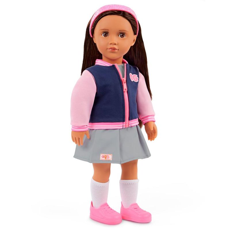 A Boneca Our Generation Marisol está pronta para um dia de aprendizado e diversão com seu lindo uniforme escolar! Ela veste um charmoso vestido cinza, combinado com uma jaqueta colegial azul-marinho com mangas rosa, tênis pink, meias brancas e uma faixa no cabelo, formando um look moderno e cheio de personalidade.