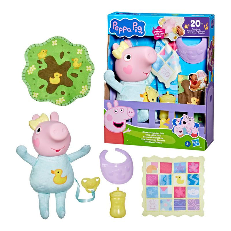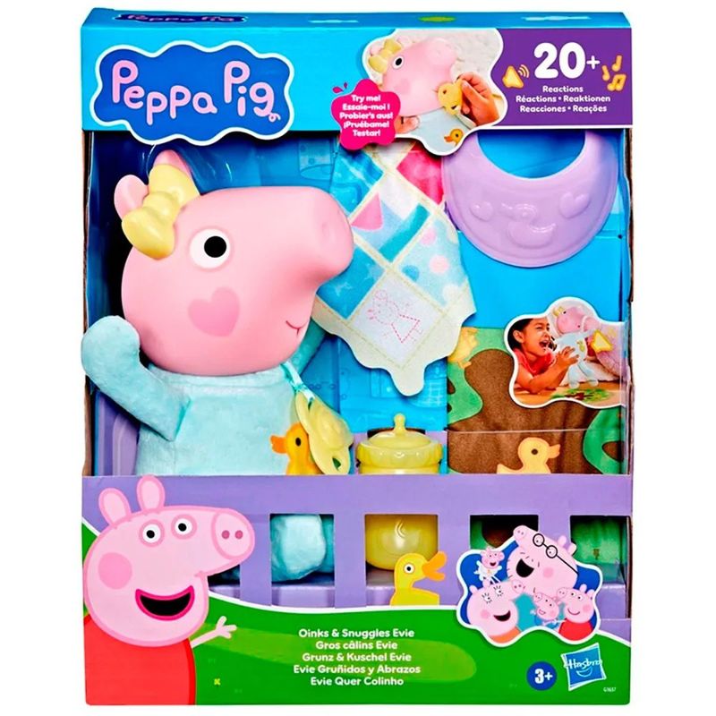 A irmã bebê da Peppa Pig, Evie, está aqui! As crianças podem recriar suas cenas favoritas do desenho animado com a boneca bebê interativa Evie com acessórios. Ativar mais de 25 efeitos sonoros diferentes dando a ela a chupeta ou mamadeira de mentira, mover para cima e para baixo ou deitar para fingir que dorme. Acessórios fofos, como um tapete, um babador e um cobertor de bebê, contribuem para a brincadeira. Os brinquedos da Peppa Pig, como a bebê Evie, são ótimos presentes para meninas e meninos a partir de 3 anos que adoram a série animada ou que se tornaram irmãos mais velhos. Estão disponíveis mais brinquedos da Peppa Pig com a bebê Evie (vendidos separadamente, sujeitos à disponibilidade).