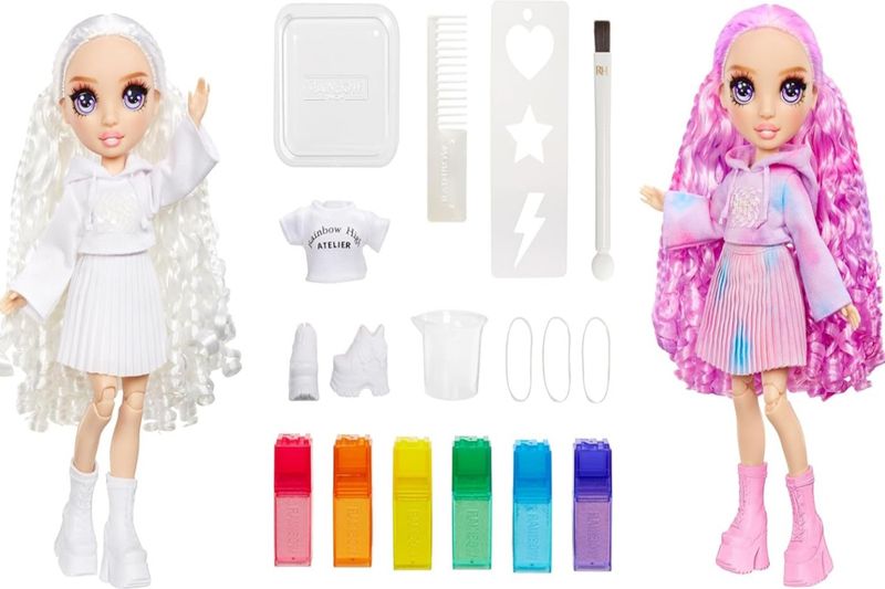 O QUE ESTÁ INCLUÍDO: 1 boneca fashion exclusiva com roupa de boneca branca completa e sapatos de boneca, top de boneca bônus, tênis de boneca bônus, 6 aquarelas laváveis ??de arco-íris, esponja de aplicação de ponta dupla, elásticos, estêncil, copo medidor, tigela descartável, colher e pente.