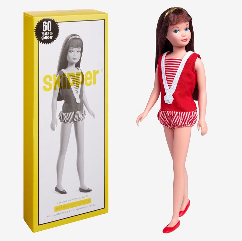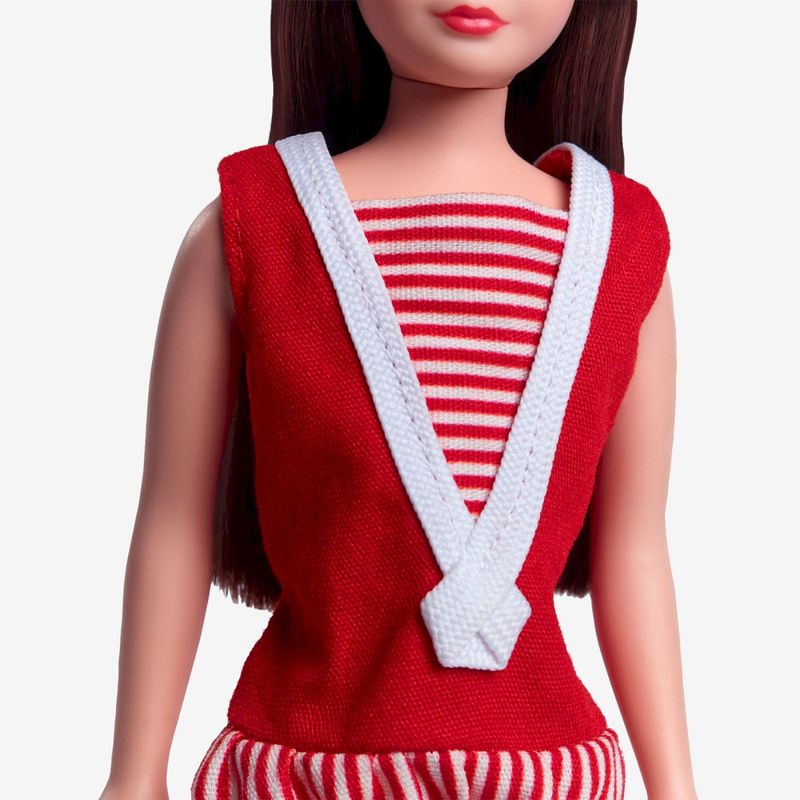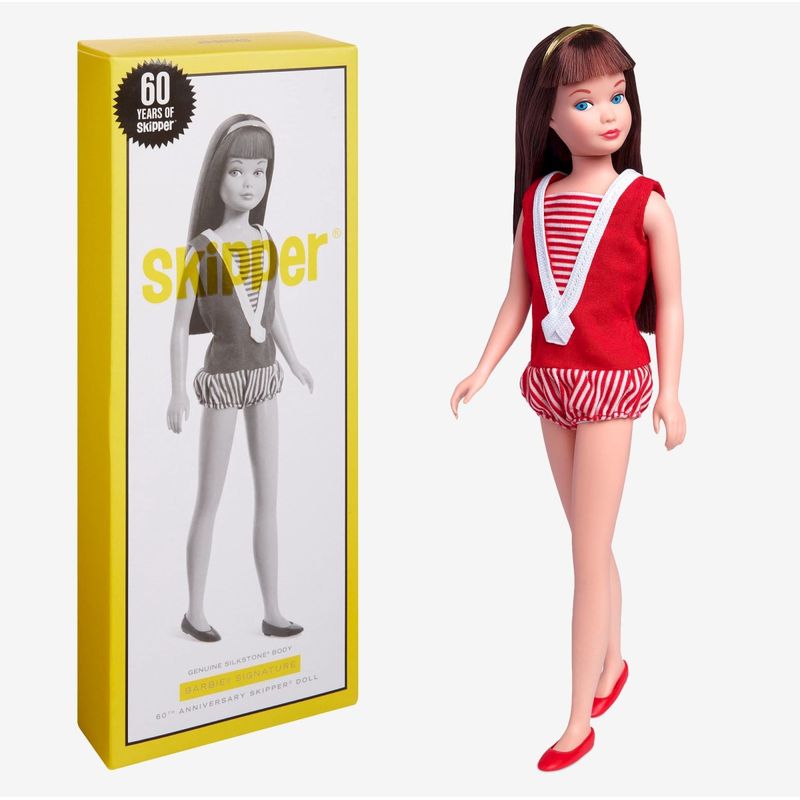 Boneca Skipper 60th Anniversary Fabricante: Mattel. Coleção: Barbie Signature Em 1964, a Mattel nos deu nossa irmãzinha favorita: Skipper. Agora, estamos comemorando 60 anos da irmã da Barbie com esta reprodução colecionável estilizada em seu maiô listrado vermelho original e sapatilhas vermelhas combinando. Aparecendo pela primeira vez em um corpo Silkstone, seu rosto é emoldurado por franjas de corte rombudo, complementadas com uma faixa dourada na cabeça. Com sua etiqueta de pulso vintage e pente e escova brancos, assim como os que ela veio em sua estreia em 1964, nossa boneca Skipper é um complemento perfeito para qualquer coleção. Contém: 1 Boneca, 1 Suporte e 1 Certificado de Autenticidade