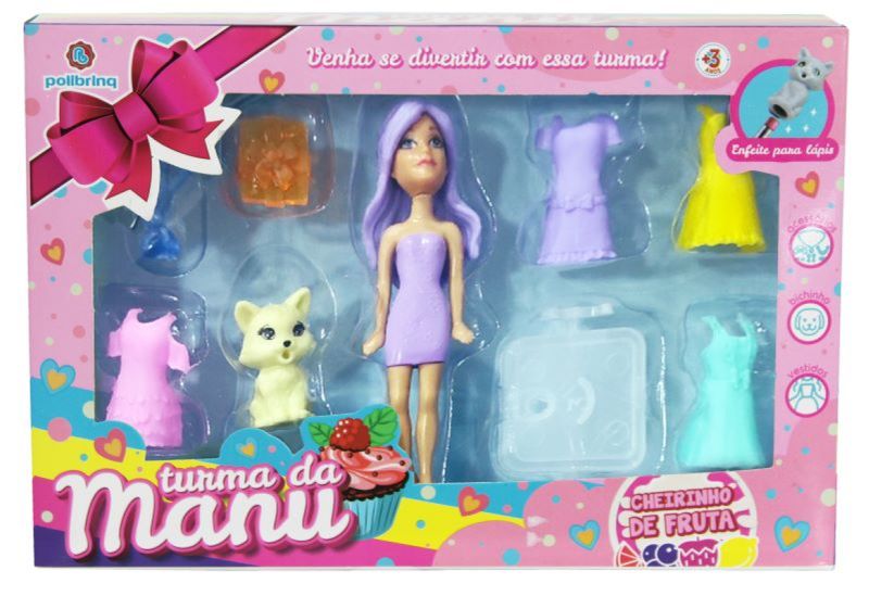 Divirta-se e solte a imaginação brincando com as bonecas da Turma da Manu! Além de lindas e estilosas elas tem um delicioso cheirinho de fruta. Crie passeios divertidos escolhendo entre diversas opções de vestido e acessórios. Leve também seu pet para passear! Características: - Marca: Polibrinq- Modelo: 301BN- Conteúdo da Embalagem: 1 boneca (9cm), 1 pet de estimação, 4 vestidos coloridos, 2 acessórios- Dimensões da Embalagem: 13cm, 20cm, 5cm- Código de Barras: 7898506729128- Alimentação: Não se aplica- Certificação: INMETRO Recomendado para maiores de 3 Anos. Importante: - Nossos produtos encontram-se em estoque- Todos os produtos são lacrados- Produtos acompanham nota-fiscal e garantia