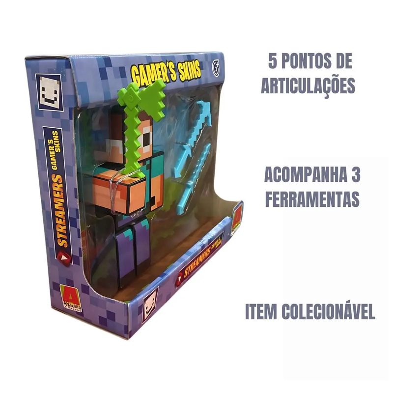 Benefícios e características Boneco articulado de 15cm: Ideal para inventar poses e recriar movimentos dos jogos. Acompanha ferramentas removíveis: Torna a brincadeira mais interativa e cheia de ação. Design gamer estilo blocado: Visual que lembra os jogos favoritos das crianças. Estimula a criatividade: Incentiva a construção de histórias e cenários.