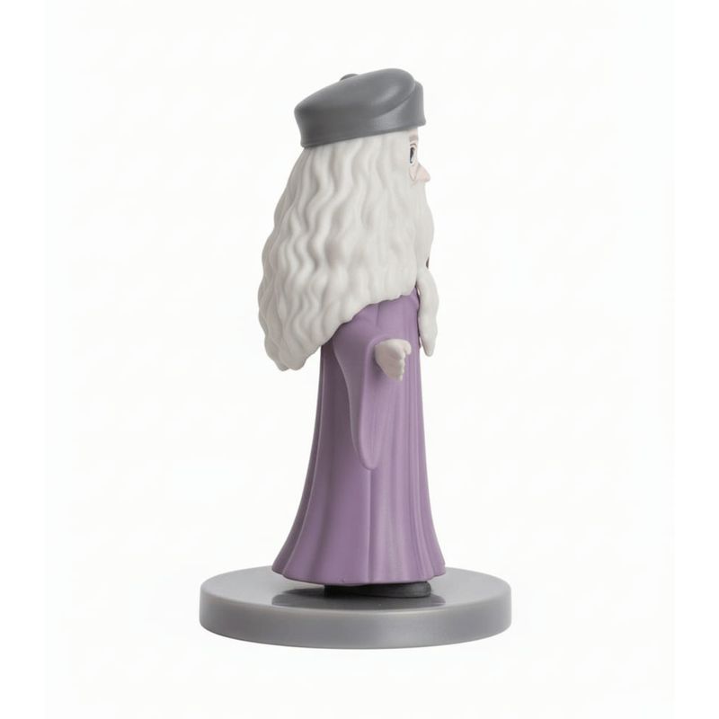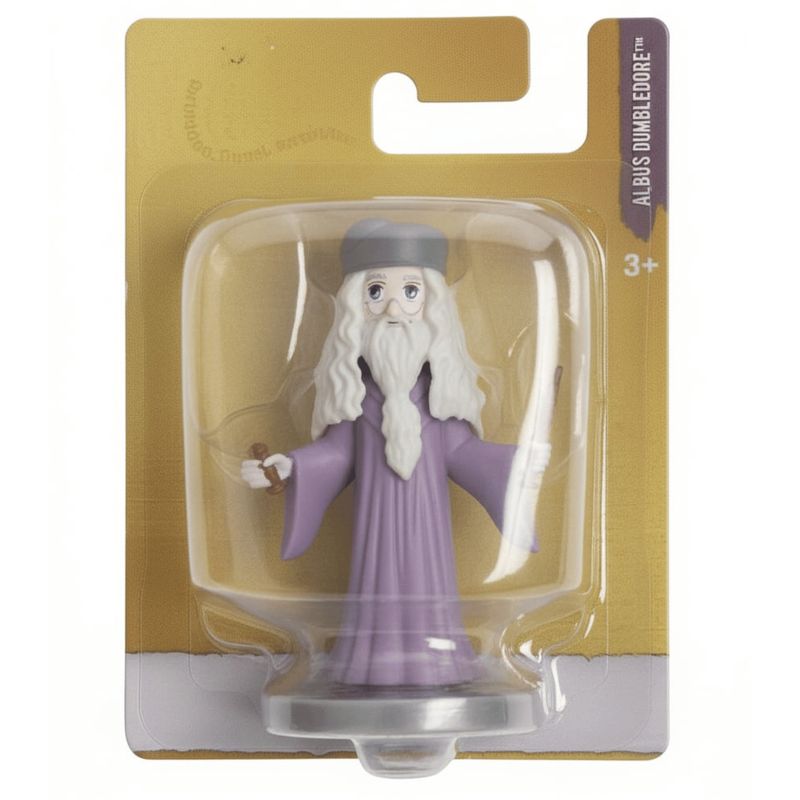 A embalagem em blister transparente permite que o boneco seja exibido em perfeito estado, ideal para colecionadores que preferem manter o item lacrado. O boneco detalhado retrata Dumbledore com seu icônico traje roxo e chapéu, segurando sua varinha. A peça vem com uma base para que possa ser exposta facilmente em prateleiras, mesas ou vitrines.