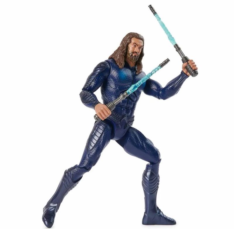 "Leve toda a ação do filme ""Aquaman e o Reino Perdido"" para sua casa, com o boneco de 30cm de Ataque Duplo. Com detalhes autênticos e mais de 15 sons únicos, ele é a escolha perfeita para recriar suas cenas favoritas ou criar novas histórias com o herói. Além disso, ao movimentar seus braços com o dispositivo localizado em suas costas, os bastões do Aquaman acendem, dando mais vida a brincadeira. "